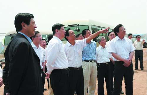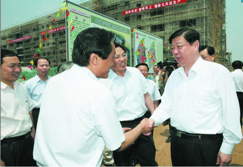 2009年5月25日,山東省委書(shū)記、省人大常委會(huì)主任姜異康在省委常委、秘書(shū)長(zhǎng)王敏以及煙臺(tái)市領(lǐng)導(dǎo)孫永春、張江汀、于愛(ài)軍等的陪同下來(lái)到山東瀚霖生物技術(shù)有限公司考察項(xiàng)目進(jìn)展情況。圖為姜異康(右)與董事長(zhǎng)曹務(wù)波親切握手。