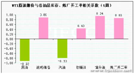 WTI原油期價與各油品庫存、煉廠開工率相關系數走勢圖。(來源:北京中期)