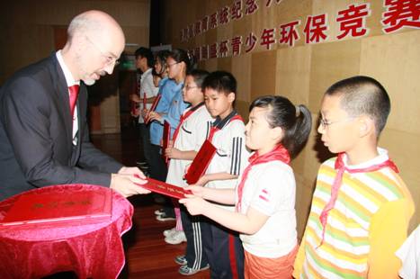 朗盛上海顏料有限公司總經(jīng)理余文廣(Wolfgang Oehlert)為2009“朗盛杯”少兒環(huán)保競賽獲獎小選手頒獎