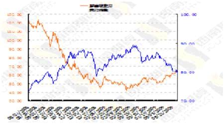 圖為原油現(xiàn)貨與美元指數(shù)走勢(shì)圖。(圖片來(lái)源:西南期貨)