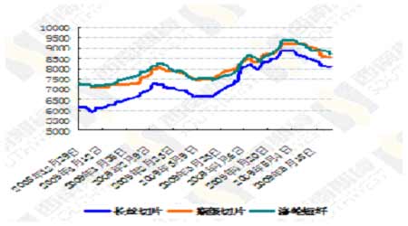 圖為長絲切片、瓶級切片與滌綸短纖價格走勢圖。(圖片來源:西南期貨)