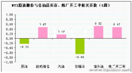 WTI原油期價(jià)與各油品庫存、煉廠開工率相關(guān)系數(shù)走勢圖。(來源:北京中期)