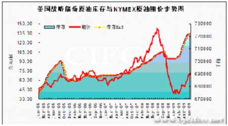美國戰略儲備原油庫存與NYMEX原油期價走勢圖。(來源:北京中期)