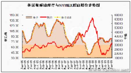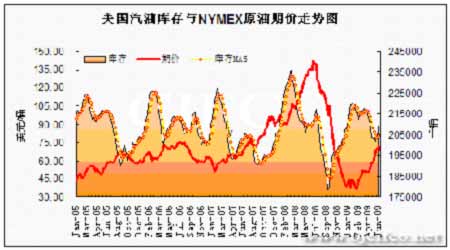美國汽油庫存與NYMEX原油期價走勢圖。(來源:北京中期)