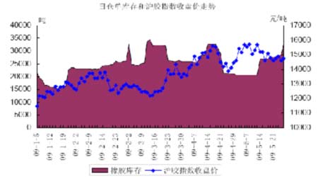 圖4:上海期貨交易所橡膠庫存及滬膠指數收盤價走勢