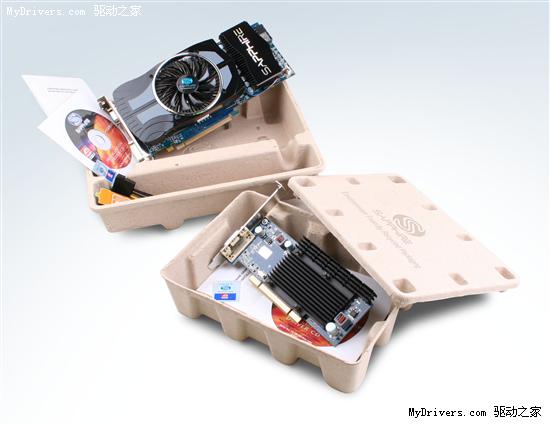 在顯卡外盒方面,藍寶科技已經采用環保型油墨并全面采用可回收材質,顯卡內盒則開始使用再生紙漿材料,運用于全系統中低階主流產品,并計劃導入所有產品線。相比過去所使用的紙板內盒,需要制作許多的折板和剪裁來放置以固定顯示卡及配件,現在使用的這種紙漿再生材質則可利用其特殊的松軟可塑性直接調整成我們所需要的模型并且可以完全的支撐顯示卡及配件,并且安全的運送達目的地,目前正使用同種方式研發出可以承載更重重量的內盒,未來希望再生紙漿的內盒可以全面取代目前的塑料或搭配泡棉,這樣一來,高階或雙核心這類體積較大、重量較重的卡也可以使用這種環保的材質了。