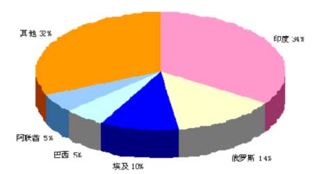 隨著我國PVC產量的迅速增加,聚氯乙烯出口數量不斷增加。從國PVC出口地主要為印度、俄羅斯、埃及、巴西、阿聯酋等五國,占出口總量的68%左右。其中印度比最大,為34.25%,因此印度經濟狀況對我國PVC出口有較大影響。
