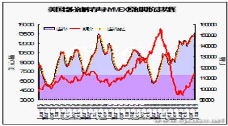 圖為美國餾分油庫存于NYMEX原油期價走勢圖。(圖片來源:EIA 北京中期)