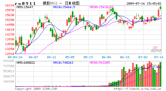 09年初以來滬膠步入“復蘇”階段。元旦后連續兩個6%擴板漲停拉開上漲序幕,1月份上漲為主,2、3月份蓄勢整理為主,4月上旬再上一個臺階,隨后基本圍繞在15000元上下進行高位震蕩。以文華滬膠指數為例,上半年累計上漲4300元,幅度近40%。最高一度上漲至16000元,價格重心不斷上移。整體持倉量穩步走高,顯示資金在不斷回流市場。期間整體商品市場均呈現上漲,對滬膠價格恢復性上漲營造了良好的氣氛。而各項經濟振興措施、環比增長數據,以及國家的收儲政策都對恢復市場人氣起到明顯作用。