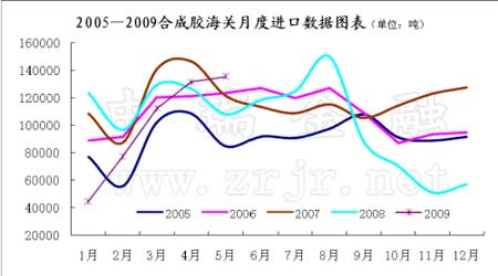 圖為合成膠海關(guān)月度進口數(shù)據(jù)走勢圖。(圖片來源:中瑞金融)