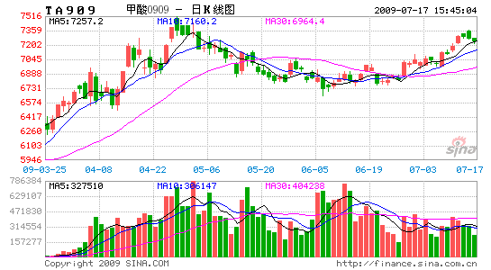 截止7月15日上午, PTA主力909合約盤中價(jià)格達(dá)到7328元/噸的水平,創(chuàng)出近10周以來(lái)的新高。而且9月合約近期出現(xiàn)增倉(cāng)上行的局面,難道要上演多逼空的行情?雖然9月合約已經(jīng)快到交割月了,但是PTA新的主力合約卻尚未出現(xiàn),9月合約上多空雙方展開(kāi)激烈對(duì)峙。與此形成鮮明對(duì)比的是,原油從70美元上方持續(xù)下跌,目前在60美元低位徘徊。PTA近期背離原油強(qiáng)勁上漲的局面能否持續(xù)呢?筆者認(rèn)為PTA短期繼續(xù)上漲空間有限。