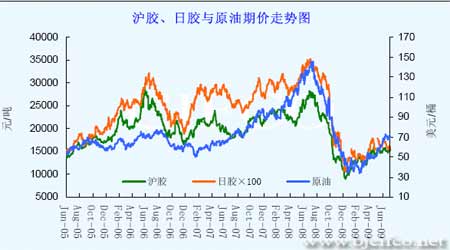 圖為滬膠、日膠與原油期價走勢圖。(圖片來源:北京中期)
