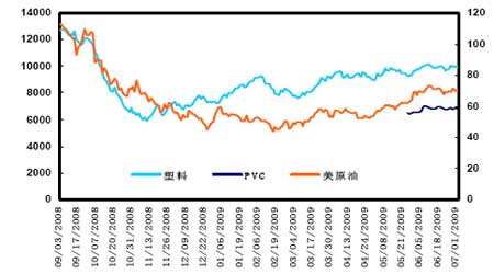 PVC期貨上市以來走勢與原油及塑料期貨價格高度相關。雖國內PVC原料上仍以電石為主,但運營成熟的原油期貨價格對日內PVC期貨的波動起推波助瀾的作用。