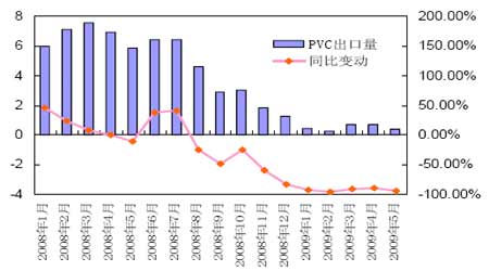 2009年5月中國大陸PVC粉樹脂出口量為4123.929噸,均價為749.52美元/噸,比上月數量減少42.33%,和去年同期相比減少92.94%;1-5月累計出口數量為26095.7噸,同比減少92.2%。