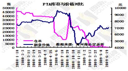 圖為PTA庫存與價(jià)格走勢(shì)圖。(圖片來源:西南期貨)