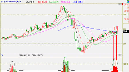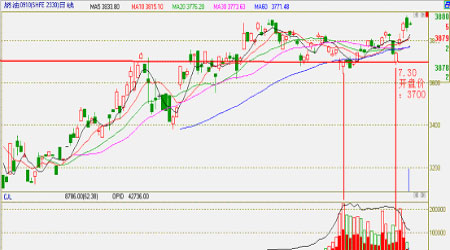 7月9日主力換月到fu0910,歷經一個月于7月30日,逐漸由fu0910換倉到fu0911。同時周線站上60日均線,內盤與外盤相關減弱,沒有大幅跟漲也沒有大幅跟跌,在3700到3850區間規律振蕩,并利用換月沖破振蕩區間,振蕩走高。