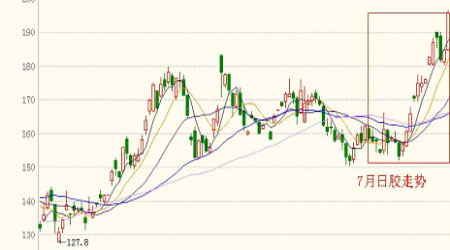 東京膠的走勢跟滬膠基本一致,受日本國內(nèi)經(jīng)濟形勢好轉(zhuǎn),日元對美元階段性上漲反彈等因素影響,日膠一掃7月上旬疲軟態(tài)勢,從7月中旬開始強勢上漲,8月3日突破197日元大關,在14個交易日內(nèi)上漲44.6日元/公斤,漲幅高達29.1%。