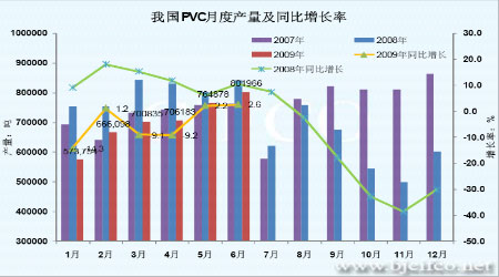 圖為2009年1-6月我國PVC月度產(chǎn)量及同比增長率走勢圖。(圖片來源:卓創(chuàng)資訊)數(shù)據(jù)來源:卓創(chuàng)資訊 單位:噸,%