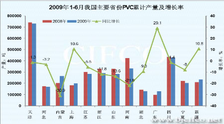 圖七: 2009年1-6月各省PVC累計(jì)產(chǎn)量及同比增長率