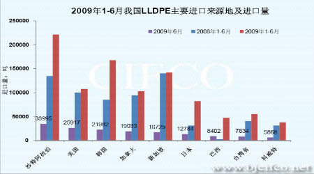 圖為2009年1-6月我國LLDPE主要出口來源地及進口量走勢圖。(圖片來源:海關總署)