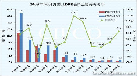 從進口海關來看,2008年前6個月,上海、深圳、天津、青島、黃埔、廈門、寧波與大連這8個口岸集中了LLDPE總進口量的91.2%,其他19個海關的總進口量不到9%。由于我國LLDPE的主要消費地區在華南、華東和華北,所以上述海關的進口量占到了絕大多數的比例。