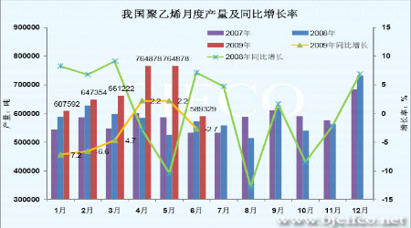國內產量方面,據統計,2009年6月國內聚乙烯產量為58.9萬噸,較去年同期(60.6萬噸)減少1.7萬噸,減幅為2.7%;1-6月累計產量為374.4萬噸,較2008年(397.3萬噸)減少22.9萬噸,減幅為5.8%。