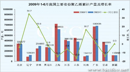 圖為2009年1-6月各省聚乙烯累計產量及同比增長率走勢圖。(圖片來源:卓創資訊)