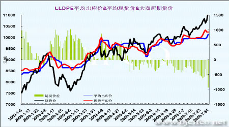 圖十五: LLDPE期貨價格與平均出廠價、平均現貨價對比圖