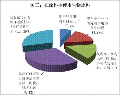 更值得注意的是,除VOC外,其他使環(huán)保涂料更加綠色的涂料技術(shù)也正在成長。在全球所有涂料配方技術(shù)人員中,39%正在使用或考慮使用生物原料技術(shù)使涂料更加綠色。這包括使用可再生的原料,或可生物分解的原料。32%表示雖然目前沒有研究項目,但生物原料技術(shù)是他們注視的方向。只有29%的配方人員完全不考慮使用生物原料技術(shù)。(圖三)