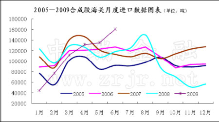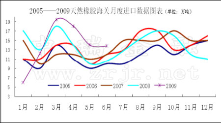 進口方面,中國海關總署公布的數據顯示,2009年1至6月,中國進口天然橡膠(包括膠乳)83萬噸,較2008年同期的84萬噸降0.8%。其中6月進口量為13萬砘。數據還顯示,1至6月中國進口合成橡膠(包括膠乳)662,032噸,較2008年同期的702,932噸下降5.8%。值得注意的是,往前6月份開始進口量就會開始回升,但今年6月份的標膠進口數量卻表現平平。進口沒有呈現規律性回升的原因主要有:1、進口標膠成本較高,理論進口成本在17000元以上。2、東南亞由于天氣因素產量減少,出口同樣減少。3、國內產量同比增長。4、復合膠和合成膠進口大幅增加,擠占標膠份額。從圖表數據可看到,6月份的進口創出今年新高,而往年這時候合成膠進口呈現下降趨勢。