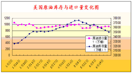 目前,美國和中國是世界上排名前兩位的原油消費大國,他們對原油需求的變化對整個世界的原油需求來講具有至關重要的作用,尤其是美國,市場經濟發達,美國的原油庫存、進口、成品油庫存等數據直接影響到紐約原油期貨市場的走勢,如圖8、圖9所示。