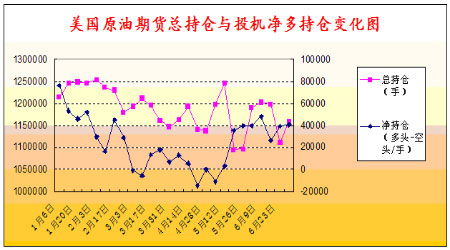 從圖13中可以看出,總持倉與投機凈多變化趨勢基本雷同,在4月底的時候,凈多持倉達到最低點,隨后開始逐步回升,這一時期,原油期價大幅上漲,6月下旬沖上70美元,隨后振蕩回落,而投機凈多持倉也同樣振蕩變化,由此可見,投機機構是推動原油期價上漲的主要力量。