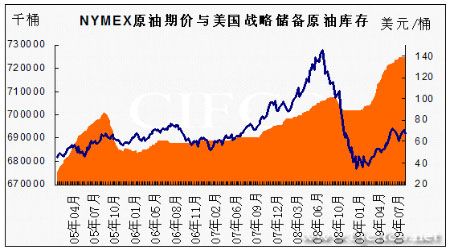 圖為NYMEX原油期價(jià)與美國(guó)戰(zhàn)略?xún)?chǔ)備原油庫(kù)存走勢(shì)圖。(圖片來(lái)源:北京中期)