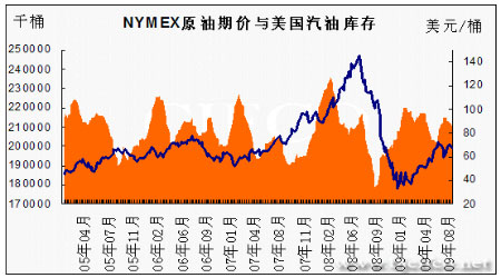 圖為NYMEX原油期價(jià)與美國(guó)汽油庫(kù)存走勢(shì)圖。(圖片來(lái)源:北京中期)