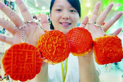 昨日,在濟南一商場,工作人員展示各種“月餅”。這種采用聚氨酯PU材料制作的仿真月餅外形與真月餅毫無差別,可以當玩具,也可作掛件配飾。中秋節(jié)臨近,這種“月餅”深受年輕人的喜愛。