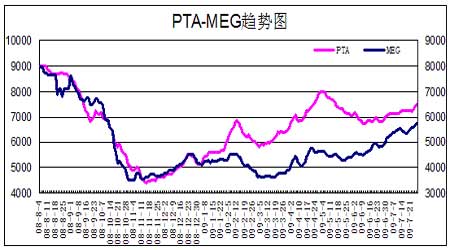 七月份,PX現貨市場上供求關系略顯緊張,隨著紡織行業銷售旺季逐漸臨近,PTA裝置的開工率有所上升,對PX也需求也有所增加,而近期日本老裝置減產明顯,國外有幾家裝置也處停車檢修之中,國內新裝置的開工率維持在70%左右,加上亞洲乙烯價格居高不下,對石腦油價格產生較大的支撐,PX的價格從980美元漲到1100美元附近,漲幅近9.5%。后市重點關注原油需求能否繼續有所提升,國內煉廠的新裝置會否大幅提升。