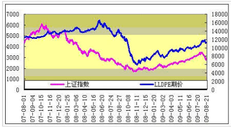 中國的股市已經(jīng)折射出經(jīng)濟有回暖跡象,LLDPE與A股近期表現(xiàn)出高度的關(guān)聯(lián)性。如下圖所示: