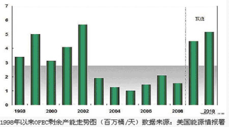圖為1998年以來OPEC剩余產能走勢圖。(圖片來源:中瑞金融)