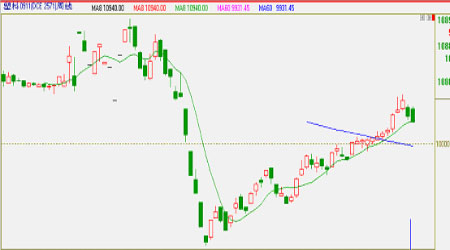 下圖所示:自2008年11月探底回升以來,歷經近10個月的穩步上行后,短期內塑料面臨修整,俗話說的好,拳頭只有收回來打出去才更有力.8周均線對價格形成了較強的支撐作用。而上方12000的阻力依然是懸在多頭心頭的一把利劍,后市若能成功逼退空軍的防守,那么上面的空間將被打開。