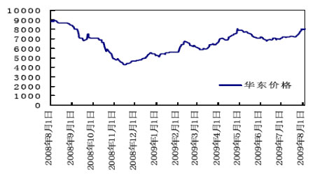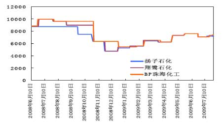 華東地區PTA現貨交易價格,7月穩步上揚,由月初7100元/噸,上升至月底8000元/ 噸。上升幅度與期貨價格相同。