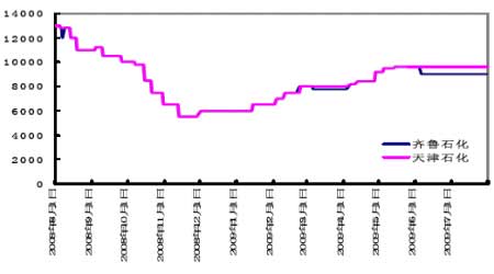 七月份國內PX出廠價格維持穩定,齊魯石化報價9000元/噸,天津石化報價9600元/噸,價格稍高于6月。