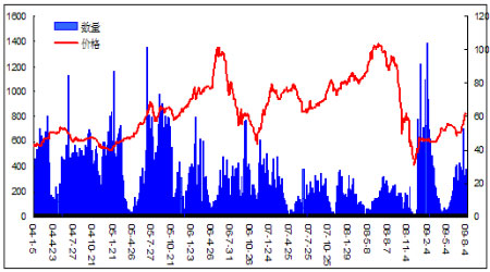 圖為泰國生膠片成交量與成交價走勢圖。(圖片來源:格林期貨)