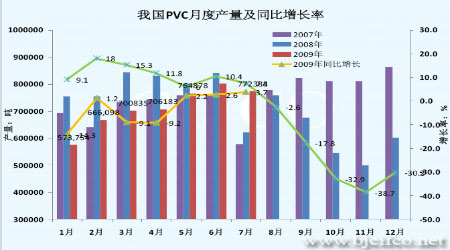 由下面的圖可以看到,2008年8月份以后,由于受國內房地產業表現萎靡和國際金融危機的影響,我國PVC的產量一路大幅下滑,從8月份到今年1月份連續6個月出現負增長,其中10、11、12月份的產量更是同比下滑了30%以上。但隨著我國一系列經濟刺激計劃的推出,國內宏觀經濟狀況逐漸好轉,國內房地產市場也從谷底觸底反彈,表現出強勁的復蘇跡象,使得對PVC的需求逐漸好轉,國內產量也不斷增加,2009年5、6、7月份連續同比出現正增長,顯示了下游需求正在復蘇。2009年7月份國內聚氯乙烯產量為77.2萬噸,較6月產量80.2萬噸減少3萬噸,減少幅度3.74%,較去年同期增加3.7%;1-7月累計產量為507.2萬噸,較去年同期減少4.4%。