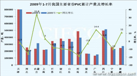 圖為2009年1-7月各省PVC累計產量及同比增長率走勢圖。(圖片來源:卓創資訊 單位:噸,%)