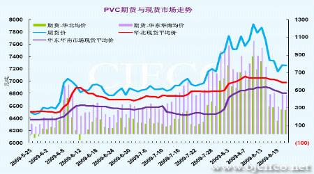 8月14日后,PVC期貨自高位回落,17日經(jīng)歷暴跌,以跌停收盤,其后幾日連續(xù)回落,最低曾至7000元一線。PVC期貨大跌,使得現(xiàn)貨市場(chǎng)心態(tài)受到較大的打壓,貿(mào)易商積極讓利出貨,相互壓價(jià),價(jià)格不斷走低,但乙烯法低價(jià)貨源較少,調(diào)整有限。另外,商家雖然出貨壓力較大,但對(duì)于目前調(diào)整多數(shù)認(rèn)為是理性調(diào)整,心態(tài)并無(wú)過(guò)分恐慌,所以適當(dāng)下調(diào)后,在期貨企穩(wěn)影響下,現(xiàn)貨市場(chǎng)逐步穩(wěn)定,目前現(xiàn)貨平均價(jià)格在6900元/噸左右。