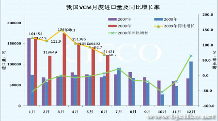 圖為2009年1-6月我國VCM月度進口量及增長率走勢圖。(圖片來源:海關總署 卓創資訊 單位:噸)