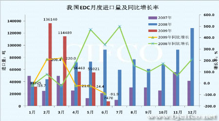 圖為2009年1-6月我國EDC月度進口量及增長率走勢圖。(圖片來源:海關總署 卓創資訊 單位:噸)
