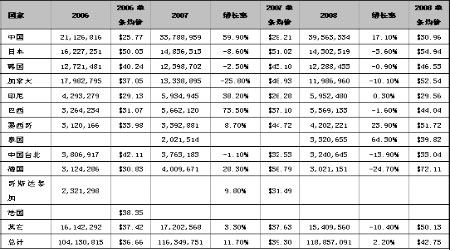 從上面數據可以看到,2006-2008 年,中國出口美國乘用車輪胎的增速分別為22.40%、59.90%和 17.10%,分別高于美國從所有國家乘用車輪胎進口增速20.60%、58.20%和14.90%,遠遠高于了平均進口增速,而從售價來說,2006 年至2008 年中國出口美國乘用車輪胎的平均價格分別為25.77 美元、28.21 美元和30.96 美元,分別低于平均價格10.89 美元(29.7%)、11.09美元(28.2%)和11.79 美元(27.6%),以2008 年的數據分析,如果中國進口輪胎提高35%的特別關稅,則平均價格增加到41.80 美元,與所有國家進口美國乘用車輪胎的平均價格達到同一水平,由此可以基本判斷中國并不會完全失去美國乘用車輪胎市場,但增速將大大下降,可能會降低到美國乘用車輪胎進口的平均增速。