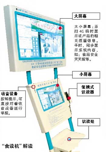 “食讀機是一部智能型、多功能的識讀設備,它能夠將4G誠信碼便攜式識讀器和食品安全誠信監管數字網絡化智能平臺的大型液晶顯示器對接,使識讀器上的內容顯示出來,一個市民查,多個市民同時可見。”黃巖松表示,目前,全市已生產32臺“食讀機”,從昨日起至國慶前將陸續投放在省會16個超市內。