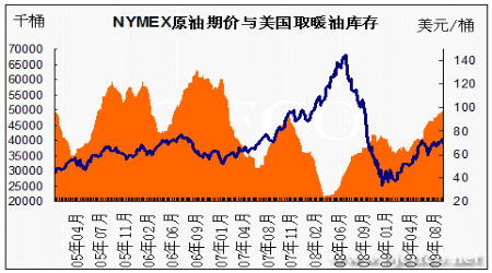 圖為NYMEX原油期價與美國取暖油庫存走勢圖。(圖片來源:北京中期)